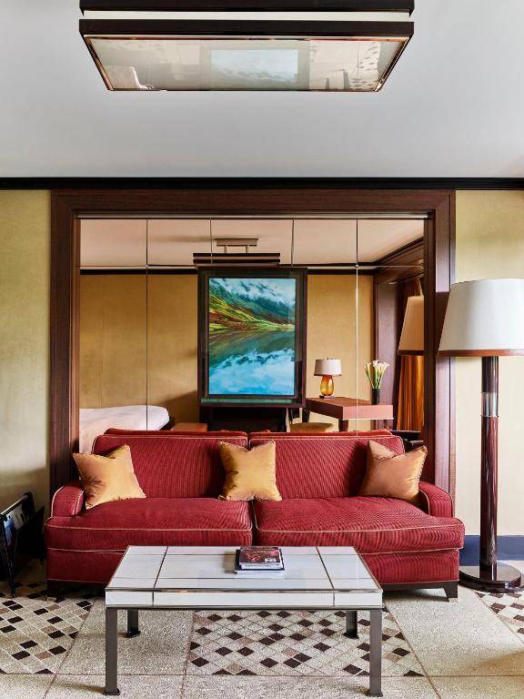 45 Park Lane is a luxurious hotel located near Hyde Park, offering a fitness studio and a modern American steak restaurant. The hotel's central staircase leads to a mezzanine with a bar, library, and private media room, all with stunning views of Hyde Park. Each room is equipped with Bang & Olufsen TVs, marble bathrooms, and free Wi-Fi, as well as Aromatherapy Associates toiletries. The on-site restaurant serves prime dry and wet aged beef, pan-roasted lobster, and fine wines, with the option of full English or continental breakfast. The hotel is within walking distance of Oxford Street and offers easy access to activities such as tennis, horseback riding, and boating in Hyde Park. The nearest tube station is just a 5-minute walk away.