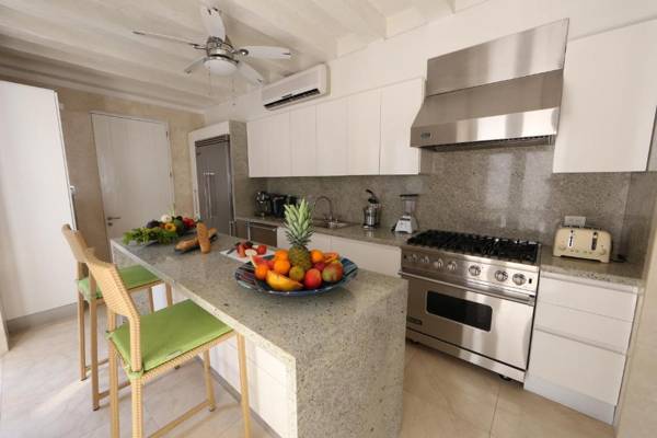 Casa La Cartujita is a boutique hotel in Cartagena's historic district, featuring a blend of modern and colonial architecture. The hotel offers free WiFi, a 24-hour front desk, and concierge services. Each air-conditioned room has a desk, HDTV, and private bathroom with L'Occitane toiletries. Guests can relax in the lounge area or on the rooftop terrace with a hot tub. The hotel also offers daily breakfast and cooking classes. It is located next to Santo Toribio Church and a 5-minute walk from Cartagena's colonial walls. The airport is a 15-minute drive away.