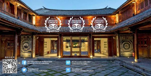 The Sky Valley Heritage Boutique Hotel in Xizhou Town combines elements of East and West in its contemporary design and traditional Bai-style building. The hotel features traditional art pieces such as calligraphy paintings and ceramics. It is located in Sili Village, 1.2 mi from Cangshan Mountain and Erhai Lake, and 12 mi from Dali Old Town. Rooms are decorated with cultural fabrics and handicrafts of the Bai ethnic group, and equipped with modern amenities. Guests can relax on the terrace, use the business center, or arrange tours at the tour desk. On-site parking and free Wi-Fi and wired internet are available. The hotel also has an on-site restaurant serving local cuisine.