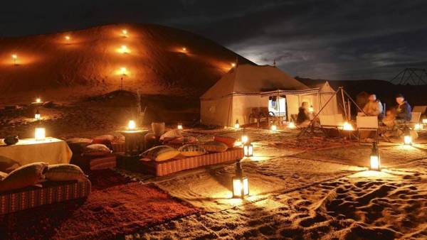 Desert Private Luxury Camp in Merzouga offers stunning mountain views and convenient amenities such as free WiFi and private parking. Each unit includes a private bathroom with a shower, bathrobes, a hairdryer, and free toiletries. Guests can enjoy a delicious buffet or halal breakfast at the luxury tent. The camp also has a terrace and offers services such as bicycle and car rentals. For outdoor enthusiasts, skiing is available nearby and the beautiful Lake Daya Tamezguidat/Flamingo is just 1.8 miles away, while Camel Trekking Sahara Tour is 1.9 miles away.
