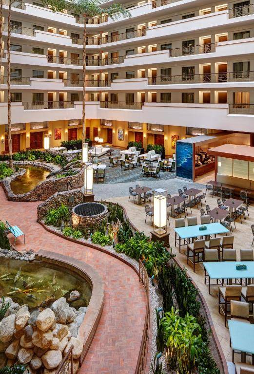 The Embassy Suites La Jolla is a non-smoking hotel located in the University Towne Center area of San Diego, just a short drive from La Jolla. The hotel offers spacious 2-room suites with separate bedrooms and living rooms, as well as amenities such as wet bars, microwaves, and refrigerators. Guests can relax and watch the 32-inch LCD TV or stay productive at the suite's workspace. A free cooked-to-order breakfast with an omelet bar is offered, as well as a complimentary Evening Reception. The on-site Indulge Restaurant and Lounge serves continental cuisine for lunch and dinner, and guests can also dine at P.F. Chang's China Bistro. The hotel's location is convenient for visiting popular attractions such as La Jolla beaches, the San Diego Zoo, Legoland California, Torrey Pines Golf Course, and Westfield UTC.