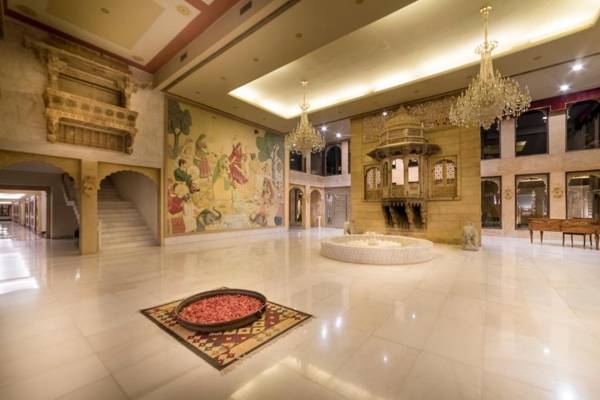 Fort Rajwada is a 5-star heritage hotel in Jaisalmer, offering a blend of traditional and modern elements. It has 4 dining options and free parking, and the rooms are equipped with a work desk, electric kettle, and flat-screen TV. The private bathrooms have hot/cold showers and free toiletries, and laundry and dry cleaning services are available. Guests can enjoy the outdoor pool and fitness center, and dine at Roopal Restaurant for Rajasthani, Indian, and continental cuisine or Pool Side barbecue for lighter meals. Paatu Bar offers Indian wine, and the hotel is located 1.2 mi from Jaisalmer Railway Station and 186 mi from Jodhpur Airport.