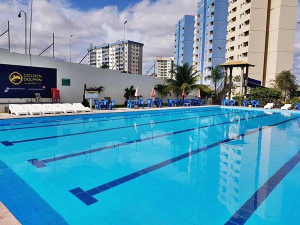 Golden Dolphin Express - Caldas Novas is a hotel located in Caldas Novas, just a short walk from Acqua Park Di Roma. It offers guests a variety of amenities including a bar, private parking, a garden, and a terrace. The hotel also has a 24-hour front desk, a restaurant, and a water park. Each room is equipped with air conditioning, a balcony with a pool view, and a private bathroom. Some rooms also have a garden view and free WiFi. The hotel has a sauna, evening entertainment, and room service. Guests can also enjoy the playground on the property. Popular attractions like Caldas Novas Yacht Club and Liberty Square are nearby. The nearest airport is just 1.9 miles away, and the hotel offers a paid airport shuttle service.