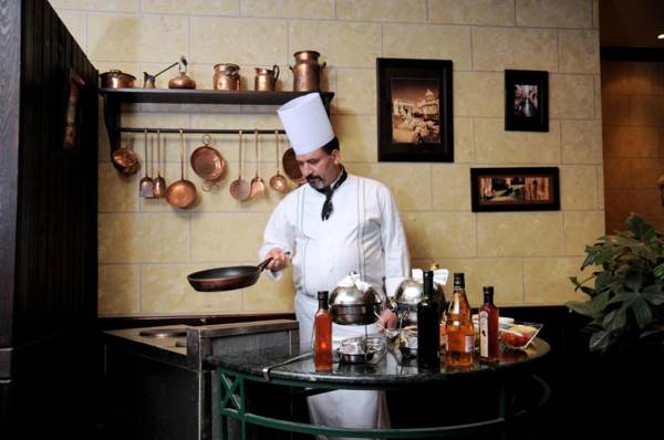 The Grand Pyramids Hotel is a luxurious resort located one mile away from the Pyramids and Great Sphinx of Giza. It boasts 7 dining options, 3 swimming pools, and a spa offering various relaxation treatments. The air conditioned rooms all have balconies with views of either the Giza Pyramids or the hotel's grounds, as well as amenities such as satellite TV and a minibar. The resort's restaurants serve a variety of cuisines, including authentic Oriental and Egyptian dishes at the Bedouin Tent and Italian fare at Lucciano. The spa offers massages and the gym has modern equipment, while children have their own separate pool.