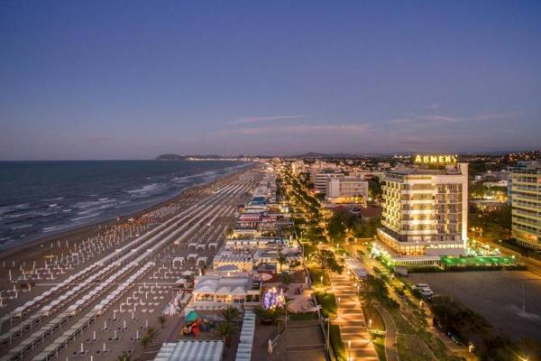 Hotel Abner's is a modern hotel located in a peaceful residential area in the center of Riccione, offering seafront accommodations. Guests can enjoy a relaxing stay by the outdoor pool or take in stunning sea views from the on-site restaurant. The hotel is conveniently located within walking distance of popular attractions such as the thermal baths, shopping areas, and entertainment venues. Free WiFi is available throughout the property. The restaurant serves both international and regional dishes, with a focus on fresh seafood and organic ingredients. Guests can also take advantage of the hotel's free bikes to explore the area. The beach and Adriatic sea are just a short walk away. Additionally, the hotel offers a reading room, piano bar, American bar, and a panoramic restaurant. During the summer, there are entertainment activities and games available for both adults and children.