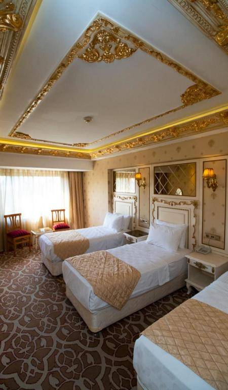 Hotel Buyuk Hamit is a luxurious and elegant hotel situated in the heart of Laleli district, close to Aksaray Tram Stop and Laleli Mosque. The rooms are beautifully decorated with gold tones and feature modern amenities such as LCD TVs, air conditioning, and mini-bars. The hotel has an à la carte restaurant, an open buffet for breakfast and dinner, and a lounge café serving drinks throughout the day. Guests can also enjoy the outdoor seating area. The popular Sultanahmet area, with its famous landmarks such as the Blue Mosque, Hagia Sophia, and Topkapi Palace, is only 1.2 mi away. Aksaray Metro Stop is within walking distance and Yenikapi Ferry Port is 0.6 mi away. The hotel is easily accessible from both Ataturk Airport (9.9 mi) and Istanbul Airport (33 mi).