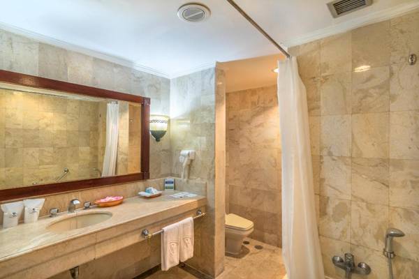 Inna Grand Bali Beach is a beachfront hotel in Sanur, offering an outdoor pool, three dining options, and free WiFi. It is a 5-minute walk to nearby restaurants and a 15-minute walk to shops and more dining options. The airport is a 30-minute drive away, with shuttle service available for a fee. The air-conditioned rooms have modern amenities and guests can enjoy views of the garden or sea. Exclusive facilities include free access to the fitness center. The 24-hour front desk can assist with laundry, spa treatments, and meetings. The hotel also has three on-site restaurants serving Asian, Indonesian, Western, and Italian cuisine.