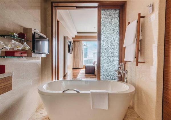 InterContinental Saigon, located in downtown Ho Chi Minh City, offers luxurious accommodations and a 24-hour fitness center. It is connected to the M Plaza Saigon for convenient shopping and is near popular attractions like Notre Dame Cathedral and Ben Thanh Market. Rooms feature floor-to-ceiling windows, marble bathrooms, and modern amenities like iPod docking stations and DVD players. The hotel also has a health club and spa with top-of-the-line equipment and signature treatments. Guests can dine at the on-site restaurants, which offer Cantonese, Italian, and international cuisine, or enjoy a drink at The Library or Purple Jade.