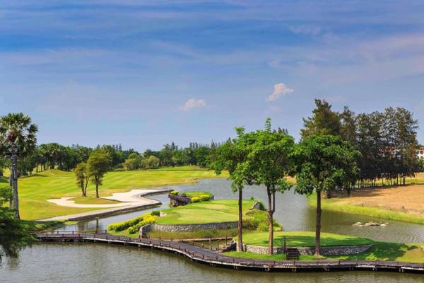 Le Meridien Suvarnabhumi Bangkok Golf Resort and Spa is a 5-star resort located on Banga-Trad Road, 15 minutes from Suvarnabhumi International Airport and 30 minutes from Bangkok's city center. The resort offers an infinity outdoor pool, free WiFi, and free shuttle services to nearby attractions. All rooms and suites have modern furnishings, a balcony with golf course views, and amenities such as a TV and seating area. The resort also features an 18-hole professional golf course, fitness center, and dining options including international and Asian cuisine. Guests can also enjoy beverages at the on-site bar.