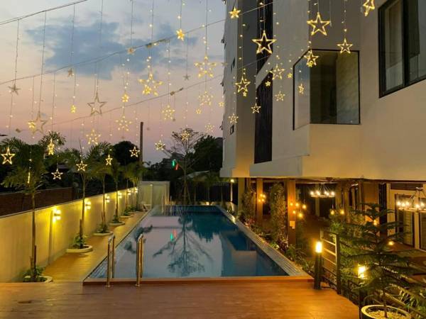 LY Residence Suite & Apartment in Siem Reap offers stunning pool views and a range of amenities including a restaurant, 24-hour front desk, bar, garden, outdoor pool, and terrace. Guests can enjoy free WiFi and private parking during their stay. Each unit features a balcony, fully equipped kitchen, fireplace, seating area, flat-screen TV, washing machine, and private bathroom with hot tub and slippers. The property also has a hot tub and shared lounge for guests to relax in, and offers activities such as cycling. Nearby attractions include The Happy Ranch Horse Farm, Artisans D'Angkor, and Angkor Night Market. The nearest airport, Siem Reap - Angkor International Airport, is just 7 miles away.