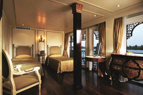 Moevenpick SS Misr is a historic cruise that travels between Luxor and Aswan, offering elegant cabins with private balconies overlooking the Nile. The ship's amenities include a large sun deck with a swimming pool, restaurants, and a luxurious bar and lounge. Each air-conditioned cabin has a flat-screen TV, mini-bar, and life jackets, and the bathrooms have both a bath and shower. The Marasem Restaurant serves gourmet dishes and features black and white pictures of the royal family, while the Dhabiyyat Bar is the perfect spot for pre-dinner drinks. The cruise is conveniently located near Luxor International Airport and offers 24-hour room service.