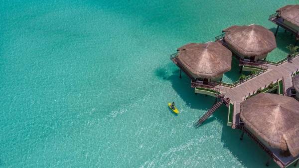 Palafitos Overwater Bungalows at El Dorado Maroma is a luxurious 5-star resort in Playa del Carmen, located 1.3 miles from the beach. The resort offers a variety of amenities including a restaurant, outdoor swimming pool, and fitness center. Guests can also enjoy free WiFi and a bar. The rooms are equipped with air conditioning, flat-screen TVs, and private bathrooms with hot tubs. Some rooms also have balconies and sea views. The resort serves continental or à la carte breakfast and offers evening entertainment. It is located near popular attractions such as Mayakoba Beach and ADO International Bus Station, and the nearest airport is Cozumel International Airport, 24 miles away.