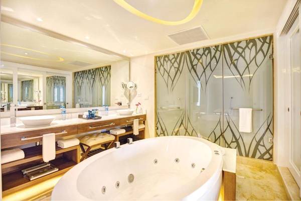 Royalton Riviera Cancun is a luxurious all-inclusive resort that offers guests a range of amenities including a spa, outdoor pool, and fine dining options. The suites are modern and well-equipped with amenities such as a coffee maker, TV, and mini-bar. Guests can enjoy stunning views of the seafront from their suites. The resort also has a private beach area, tennis courts, and various activities like windsurfing and snorkeling. The highlight of the resort is its elegant Casino del Mar, which offers a variety of slot machines and table games for guests to enjoy. Charges may apply for the casino experience.