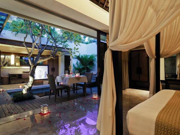 The Amala is a luxurious wellness retreat in Bali's Seminyak area, featuring elegantly decorated villas with private patios and pools. Guests can enjoy both a peaceful atmosphere within the resort and the lively surrounding area. The resort offers free daily mini-bar and welcome massage, as well as 24-hour butler service and deluxe bath amenities. All villas have modern amenities such as flat screen TVs and free Wi-Fi, and some have outdoor showers and bathtubs. The on-site Bamboo Restaurant serves a variety of delicious cuisine, and guests can also participate in yoga and pilates classes or enjoy spa services. The resort provides transfers from the airport and free parking.
